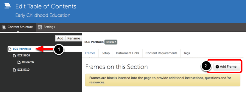 Frames added to a Table of Contents will appear in student Portfolios while editing, and optionally in their final portfolio. Frames can include instructions for the student, information about the course or assignment, files for added instruction, and forms for the student to complete. This lesson will walk you through the process of adding frames, and will teach you about the various options available to you.