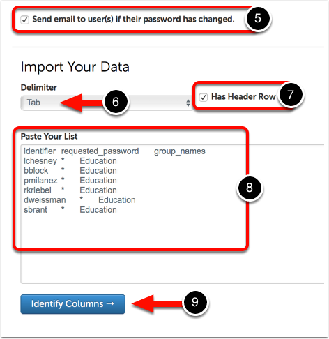 Password: The user’s password can be updated. If this column is defined using * in the row, a new password will be generated automatically. Column Header: requested_password