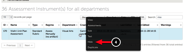 4. Locate the Assessment Instrument that you would like to view and click on it to reveal its options. Select Hide.
