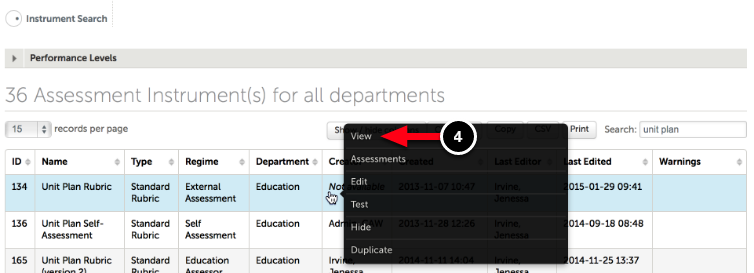 4. Locate the Assessment Instrument that you would like to view, and click on it to reveal its options. Select View.