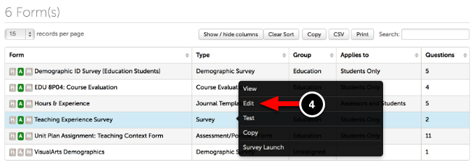 4. Locate the form that you would like to edit and click anywhere on its row to reveal its options. Select Edit.