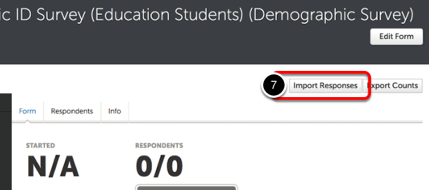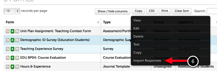 6. Locate the form that you would like to import responses to and click anywhere on its row to reveal its options. Select Import Responses.