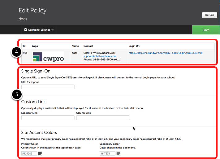 Site Contact Information: The contact information will appear on your institution's login screen, as well as in the bottom, left corner of every screen within your Anthology Portfolio site. It will serve as a means for students to contact local support at your institution. You can add a primary and secondary contact name, phone number, and email address.