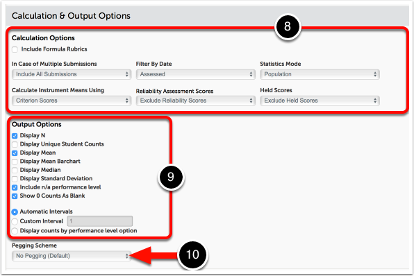 • Calculate Rubric Means Using: You have the option to calculate instrument means using Criterion scores or Overall scores.