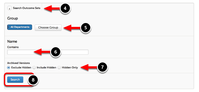 7. Under the Archived Versions heading, select if you would like to exclude hidden Outcome Sets, include hidden Outcome Sets or display hidden Outcome Sets only.
