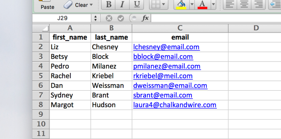 - First Name: Enter the user's first name, formatted as "First" (i.e. John). The column header should be first_name.