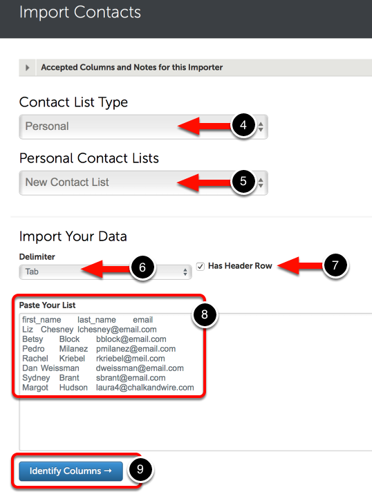 6. Select the Delimiter. If you will be pasting your import text from a spreadsheet, select Tab.