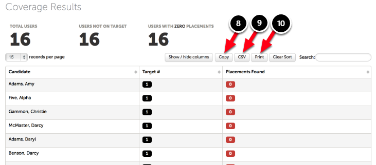 The results from your Placement Coverage Report will appear in a table. The table will list all of the users that match your search parameters, along with their target number of placements and the number of placements in the system for that user.