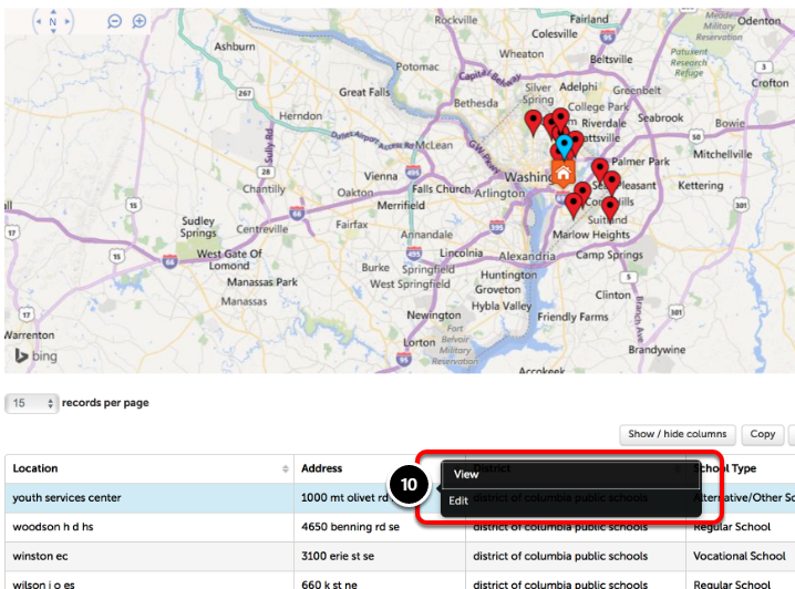 10. Click on the location that you would like to review and click anywhere on its row to reveal its options. Select View or Edit.
