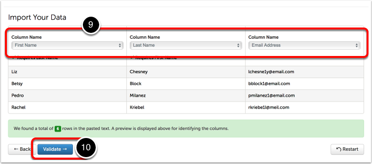 9. Enter the new user(s) information into the text-entry box by copying and pasting from an Excel spreadsheet OR by manually entering the information. You must enter a valid email address for all new users in order create the account.