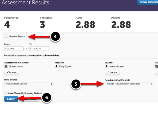 A table containing student results will appear below. Use the table to locate the Resubmission Request in question.