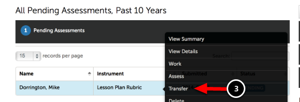 3. Locate the appropriate Pending Assessment, and click on the Student's name to select Transfer.