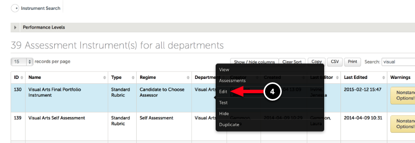 4. Locate the Assessment Instrument, and click on its row to reveal its options. Select Edit.