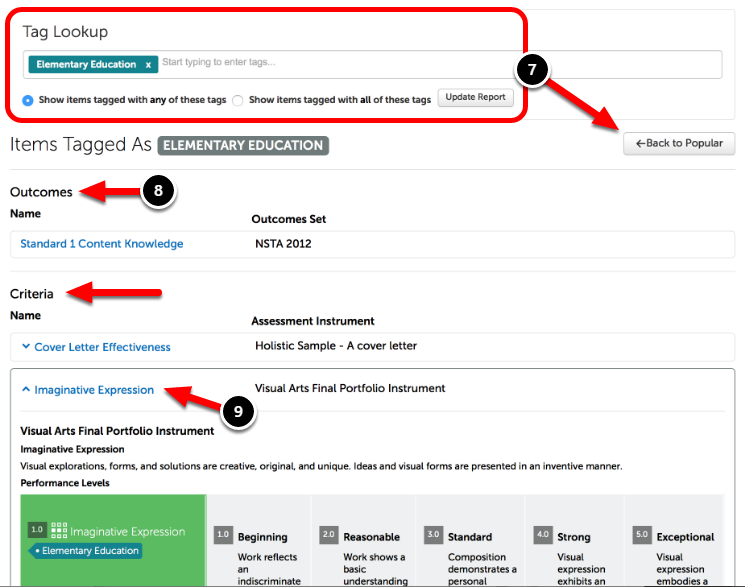 8. All items tagged with your selection(s) will appear organized by type. For example, all criteria that are tagged with your selection(s) will appear under "Criteria".