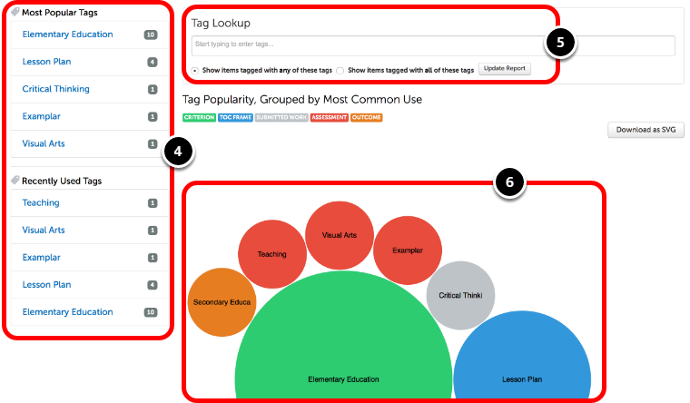6. All tags in your system will appear in an interactive "map" on the screen. The colors of each circle indiciate how that tag is primarily used (i.e tagged criteria, assessments, table of contents frames, etc.) Click on any of the circles to view items in your Chalk & Wire site which utilize the tag.