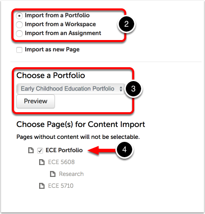 3. Select the Portfolio/Workspace/Assignment from which you would like to import content.