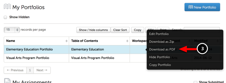 3. Click anywhere on the portfolio's row to reveal its options. Select Download as PDF.
